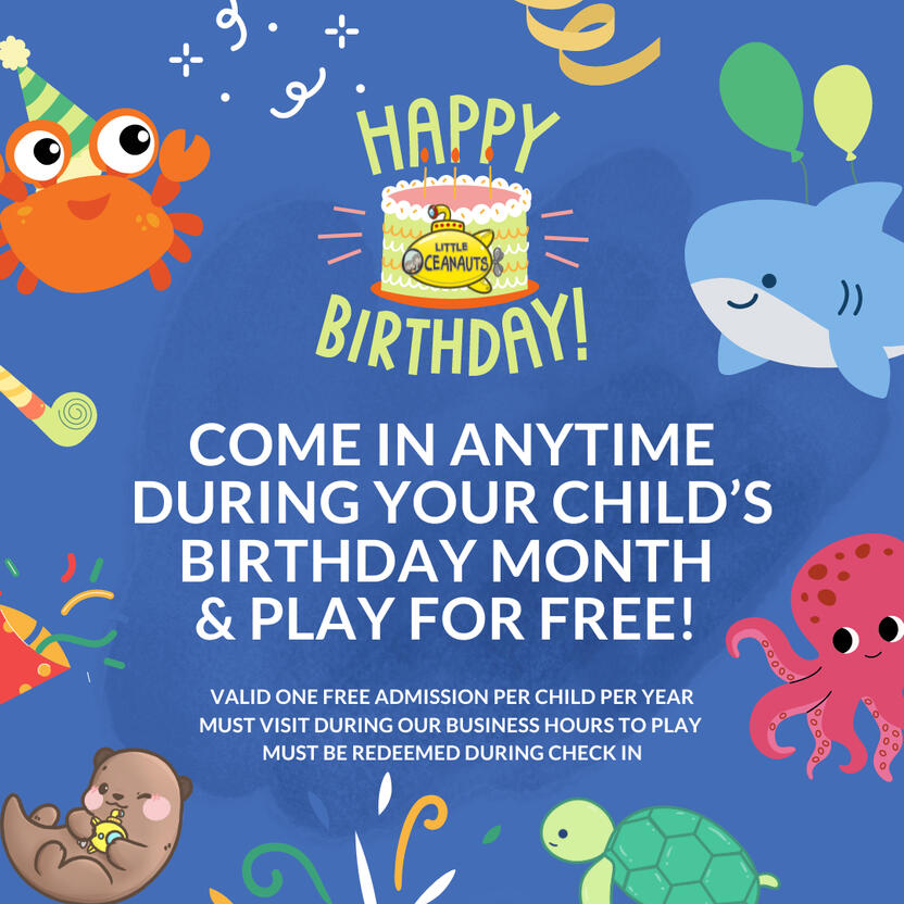 Come in to redeem their free admission to play at Little Oceanauts, anytime during the month of your child's birthday. Admit one pass per year.