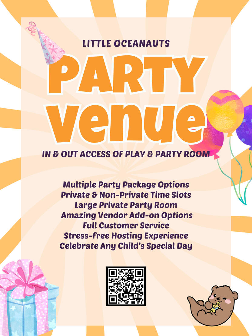 We know how stressful throwing a party can be especially for energetic little ones running around. At Little Oceanauts, we aim to provide exceptional service so that you can have the smoothest party celebration ever.We have 3 party packages that you can choose from (Classic, Deluxe, Ultimate, & Elite) ranging from 2-3 hours long (or more for a fee). Parties start as early as 10:00am and can end as late as 9:30pm.Don't mind sharing the playroom with our walk in guests? Book your party anytime before 6pm.Want a private party? Book your party anytime after 4:15PM. (additional fee of $250)Want to add more time for fun? Check if time extensions are available for your selected date.Due to high demand, we advise that you to book at least 2-3 months in advance.